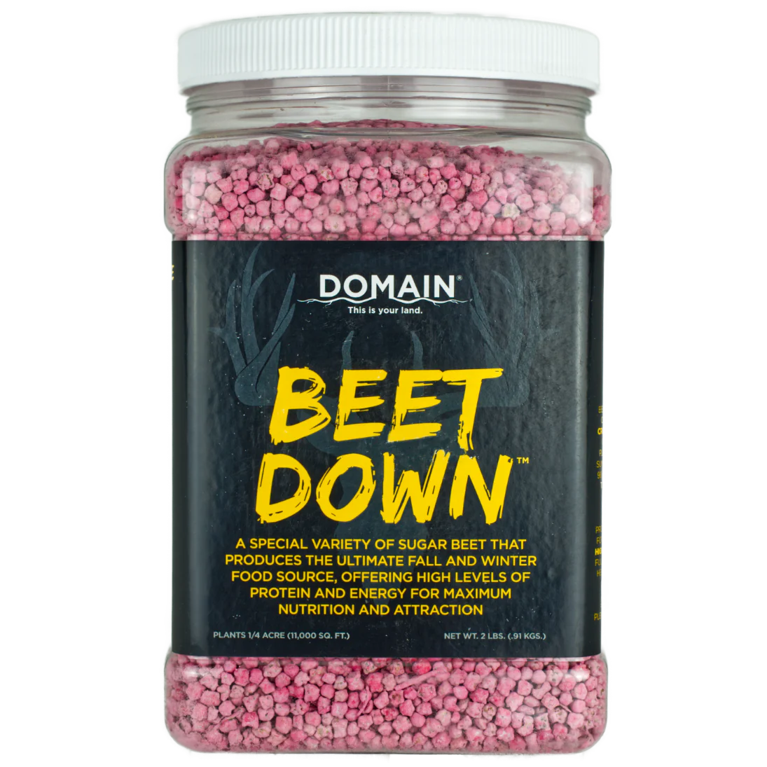 BEET DOWN IS BEST PLANTED ON ITS OWN AND CAN PROVIDE A HARDY CROP THAT CAN ADAPT TO A VARIETY OF GROWING CONDITIONS. PLANTED IN THE SPRING OR EARLY SUMMER, BEET DOWN WILL MATURE IN 90 TO 100 DAYS AND CAN PROVIDE 10-15 TONS OF FORAGE PER ACRE (IN OPTIMAL GROWING CONDITIONS). WHILE IT DOESN’T HANDLE COMPETITION WELL, ONCE ESTABLISHED BEET DOWN WILL PROVIDE HIGH PROTEIN LEAFY GREENS FOR EARLY SEASON ATTRACTION AND HIGHLY DIGESTIBLE TAP ROOTS PACKED WITH ENERGY FOR LATE SEASON. COLD WEATHER WILL HELP INCREASE THE SUGAR (ENERGY) CONTENT OF THE TAP ROOTS AND ATTRACTIVENESS TO DEER, BUT EXPECT BEET DOWN TO PROVIDE PLENTY OF ATTRACTION ALL FALL LONG. WHEN PLANTING BEET DOWN, MAKE SURE YOUR PH IS IN THE DESIRED RANGE (6.2-7.0) AND DO YOUR BEST TO CREATE A GOOD SEED BED, VOID OF ANY COMPETITION OR DEBRIS. WE UTILIZE A SPECIAL COATING MATERIAL ON ALL BEET DOWN SEEDS TO HELP IMPROVE GERMINATION AND YIELD…WHICH ALLOW YOU TO MAXIMIZE FORAGE PRODUCTION AND ATTRACTIVENESS TO DEER.