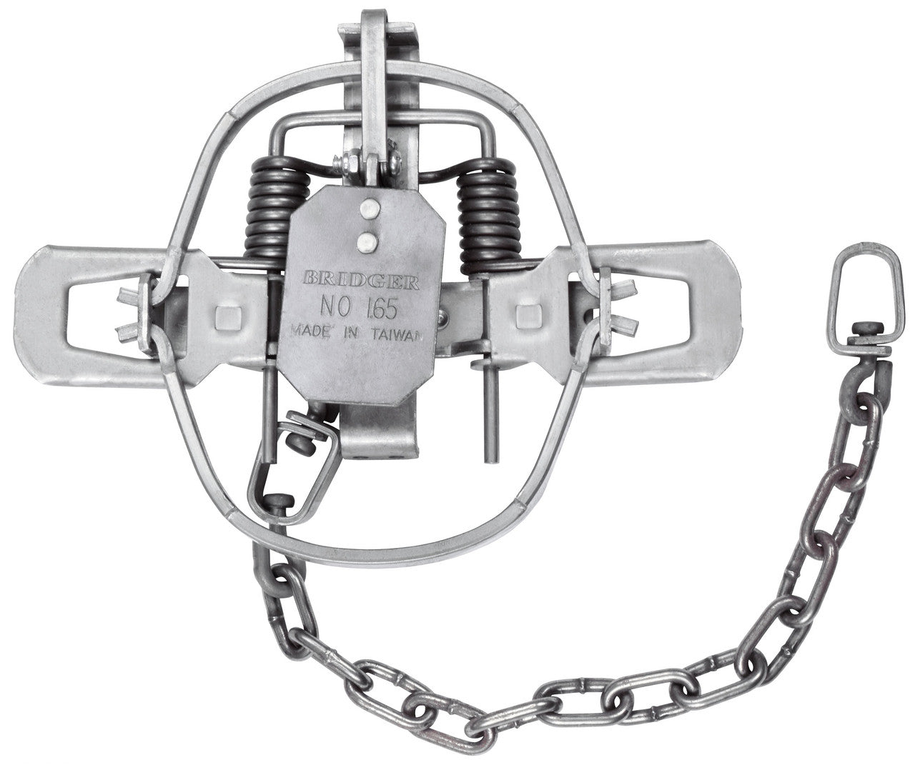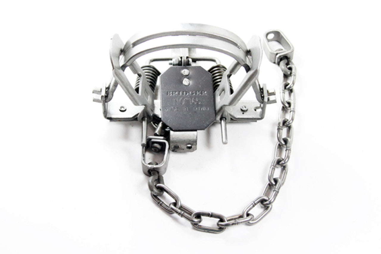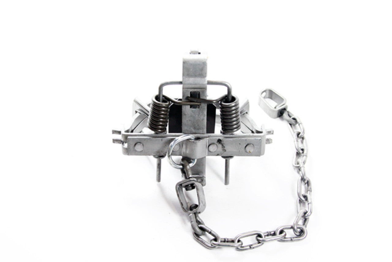 The Bridger #1.65 coilspring trap has an outside jaw spread of 5 7/16”. It is available in a regular (closed jaw) option or with an offset (3/16 gapped) jaw. You also have a choice of a two or four coil trap. We recommend this size trap for fox, raccoon, or opossum. Comes stock with baseplate and center swiveled D-Ring.