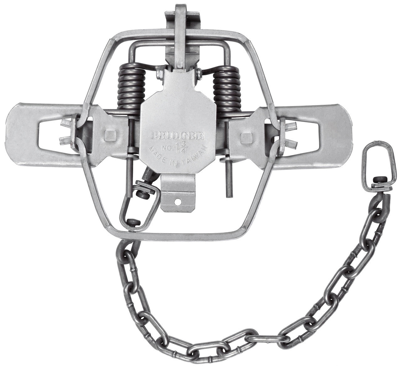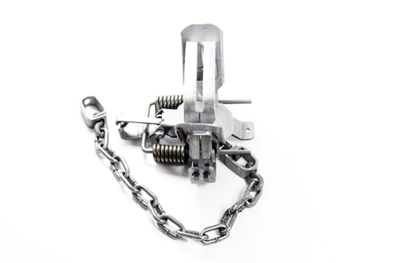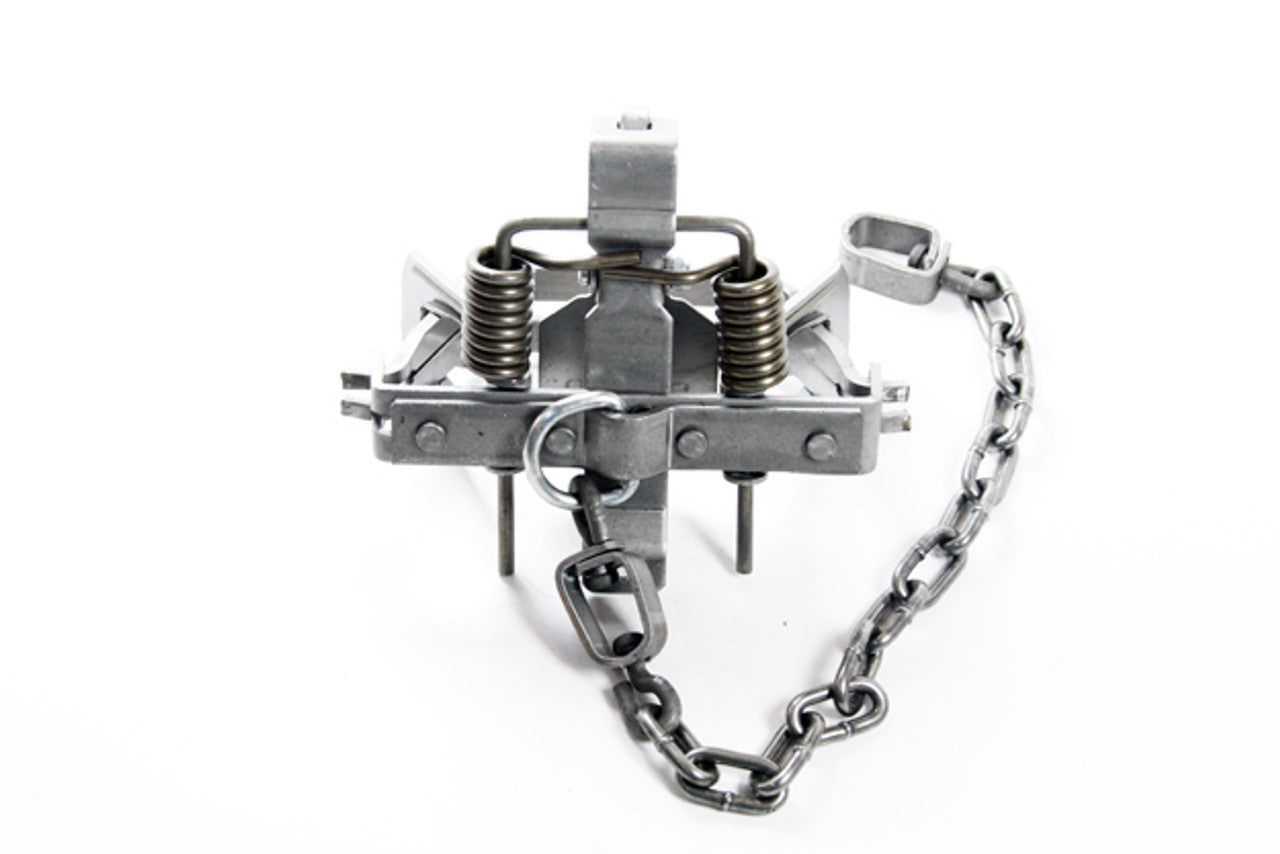The Bridger #1.75 Coilspring Square Jaw comes stock with a night latch dog and double posted pan, heavy swivels, quality straight link machine chain, music wire springs, and an added baseplate with D-Ring. We settled on a size of 4 3/4" inside jaw spread and 5 1/8" outside jaw spread to keep it legal in virtually every state. Some trappers will want to outside laminate this trap with 3/16" rod and with these dimensions it will come in just under the magic 5 1/2" outside jaw spread that some states require. The measurements of this trap are nearly identical to the MB-550. In field testing in several states this trap proved itself on fox, coyotes, bobcats, and raccoon. This is a tremendous trap for the mixed specie trapper.