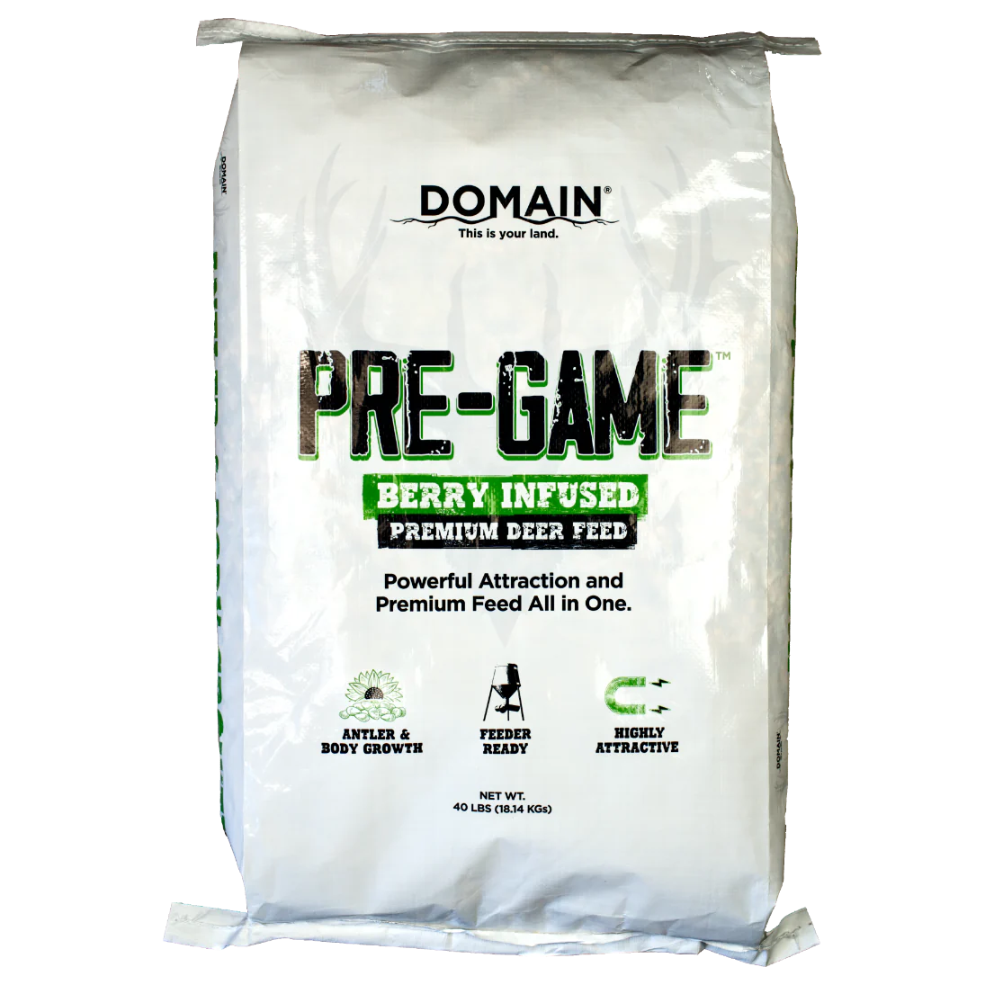 DOMAIN’S PRE-GAME PREMIUM DEER FEED IS A TEXTURED FEED DESIGNED TO ATTRACT AND FEED DEER ON A YEAR ROUND BASIS BY PROVIDING OPTIMAL LEVELS OF PROTEIN, ENERGY (FAT), VITAMINS AND MINERALS.  IT IS A COMPLETE FEED PRODUCT THAT WILL AID IN IMMUNE SYSTEM SUPPORTBODY GROWTHANTLER GROWTH AND OVERALL HEALTH OF YOUR HERD.  PRE-GAME IS INFUSED WITH A SPECIAL NEWBERRY FLAVORING AND AROMA TO ENCOURAGE LONG RANGE ATTRACTION AND OFFER A FLAVOR PROFILE THAT WILL HAVE YOUR DEER BEGGING FOR MORE.  PRE-GAME IS COMPRISED OF PROTEIN PELLETS, CORN, SUNFLOWER AND CRUSHED PLANT PROTEINS TO OFFER FLEXIBILITY IN HOW YOU FEED IT.  IT CAN BE GROUND FED OR USED IN A VARIETY OF TROUGH OR GRAVITY STYLE FEEDERS.  WITH IT’S RATIO OF PROTEIN TO ENERGY PRE-GAME WILL OFFER AN OPTIMAL FEED PRODUCT DURING GROWING SEASON TO HELP MAXIMIZE ANTLER GROWTH AND BE THE FOCUS OF ATTENTION WHEN WEATHER TURNS COLD IN THE FALL AND WINTER.  PRE-GAME IS DESIGNED TO BE USED ON IT'S OWN BUT CAN ALSO BE ADDED TO CORN OR PROTEIN PELLETS AS A SUPPLEMENTAL FEED OFFERING.